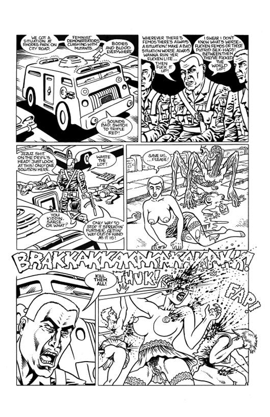 Spore Whores is set in an apocalyptic future where a devastating and insidious reproductive virus infects humanity. No one knows its origin, nor is there a cure. But its effects are obvious: infected women become riddled with the virus and are driven by a feverish rage to pass its malignant spores onto men through intense sexual activity. Meanwhile men infected by the spores turn into mutated monsters, carriers of the spores, looking for female victims to pass the spores to. And so the cycle continues…