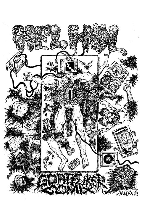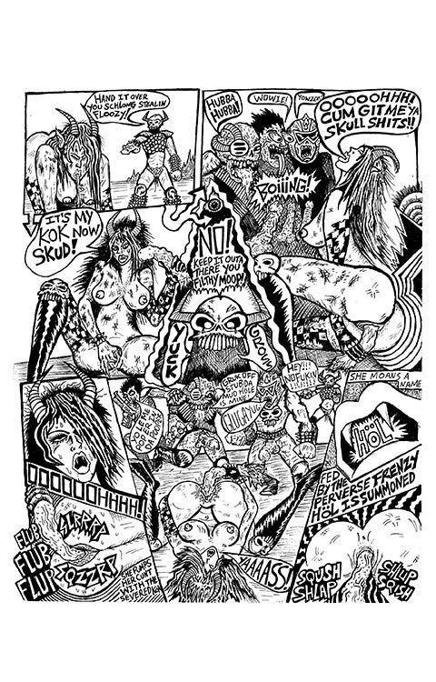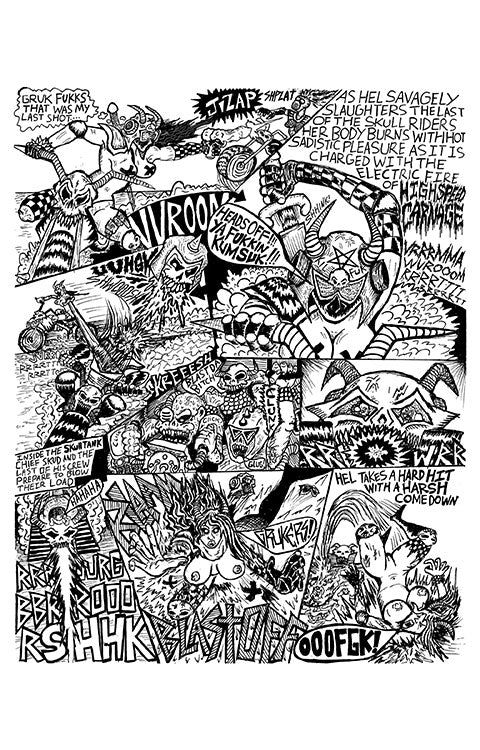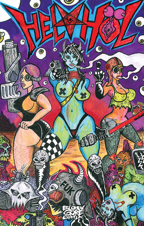 Ever wonder what Tank Girl would look like as a satanik splatter porn comic drawn by S. Clay Wilson? Join the titular demoness on her ultra violent slaughter fest though a post apocalyptic wasteland of mutant war gangs and demonik lust. HELHÖL is a nightmarish wet fever dream from the sleaziest depths of underground comix and drenched with the radioactive gore of a dying world. This edition includes the original self published comic from 2018 along with new material and guest art by Steph Dumais and Horsefuker666.