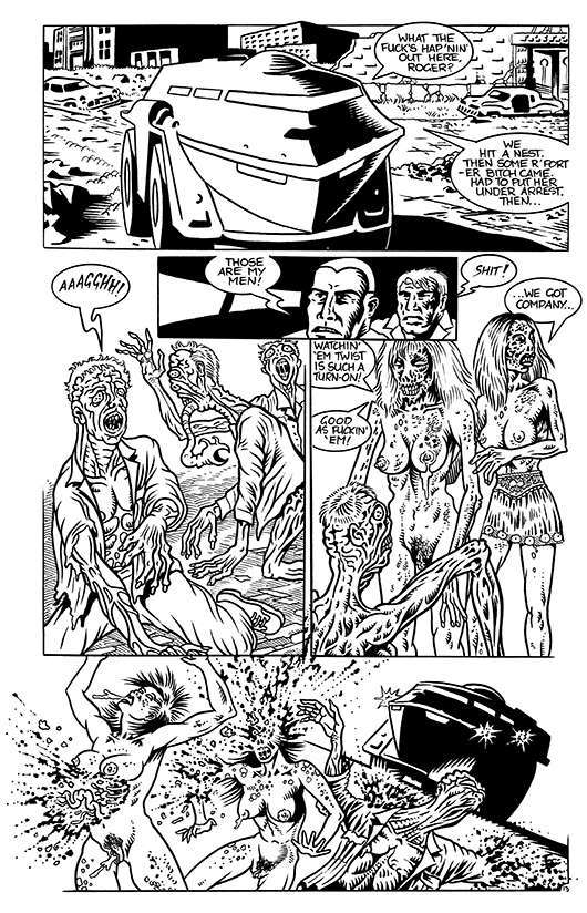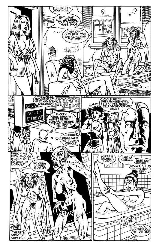 Just a quick note to say how much I enjoyed Spore Whores. It had far more actual story and a more interesting premise than the usual sex and violence comic. Great the way you created the life cycle of the disease through male and female hosts. So many sex and violence comics are created by artists who just want to draw outrageous stuff and only put a bare minimum into story and dialogue. So happy to see that this was an exception with prodigious amounts of profanity to boot!